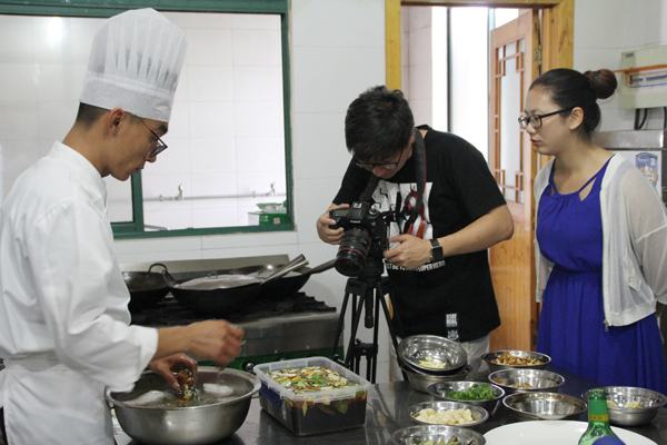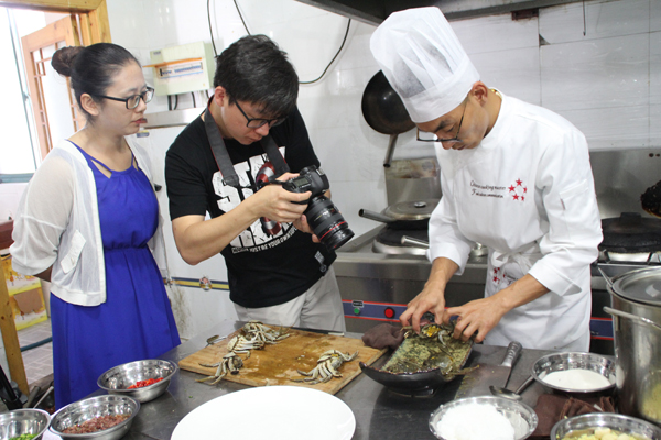 红膏公司主厨周茂俊精心制作的花雕醉蟹、泰式咖哩沙蟹、冰镇蟹、牛肉丁蒸蟹、蒜白XO酱生焗蟹和家常面托蟹,以其工艺精细、配料精选、厨艺精湛,色、形、味、美,让摄制组一行忘记了时间、忘记了饥饿、忘记了行程,待到各式蟹肴摆上餐桌,有蟹的原汁原味,有蟹的美滋鲜漓,还有蟹的尽致难言……,让人怦然心动、馋然欲滴,麻辣、酸甜、果蔬、咖哩……,摄制组一行高兴的和周茂俊厨师合影留念。