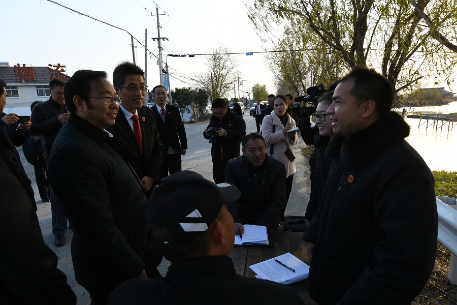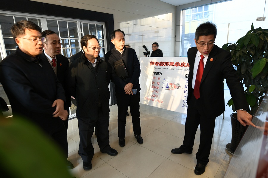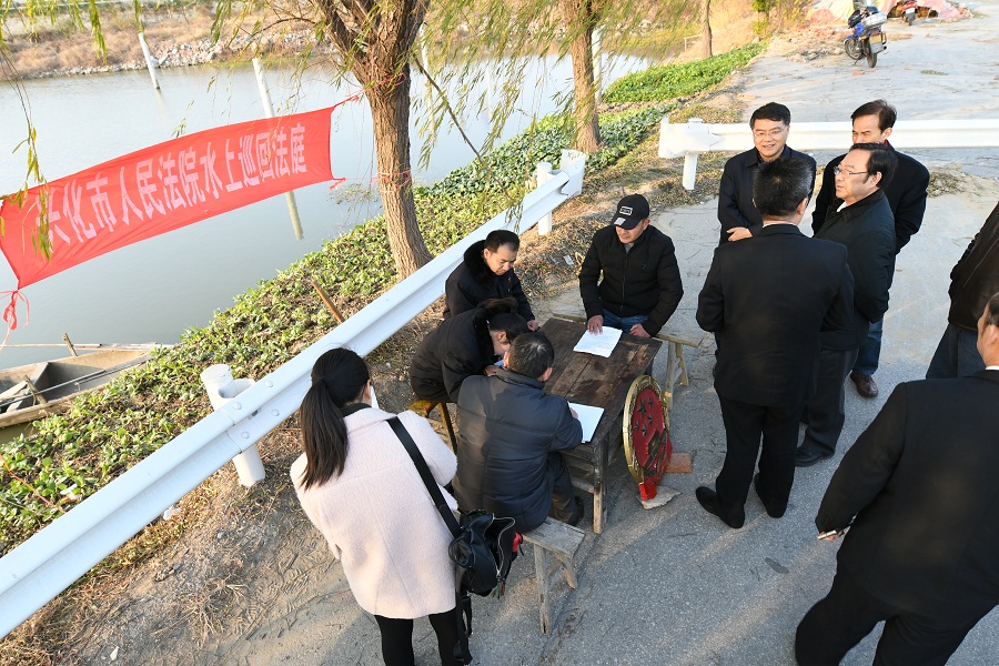 公丕祥一行观摩了兴化法院水上巡回法庭庭审现场,并实地查看了该院执行指挥中心、绩效考核指标公布现场。座谈会上,市中院党组成员、副院长宋亚平和兴化法院党组书记、院长张伟分别就大数据在智慧法院建设中的运用情况作汇报交流。