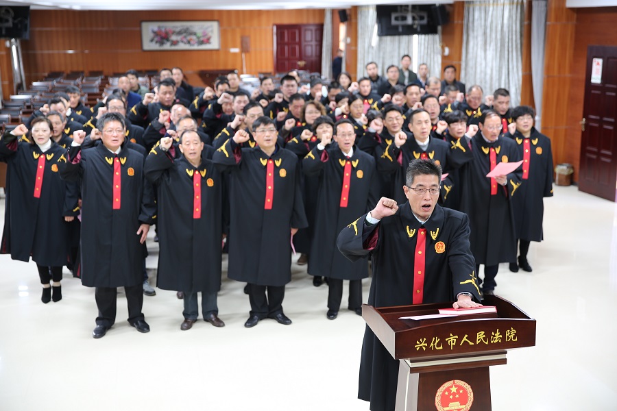上午10点15分,兴化法院与最高人民法院同步举行宣誓仪式。在党组书记、院长张伟的带领下,全体员额法官身着庄严的法袍,面向国旗,右手握拳,庄严宣誓。代表、委员们在旁见证了这一神圣时刻。